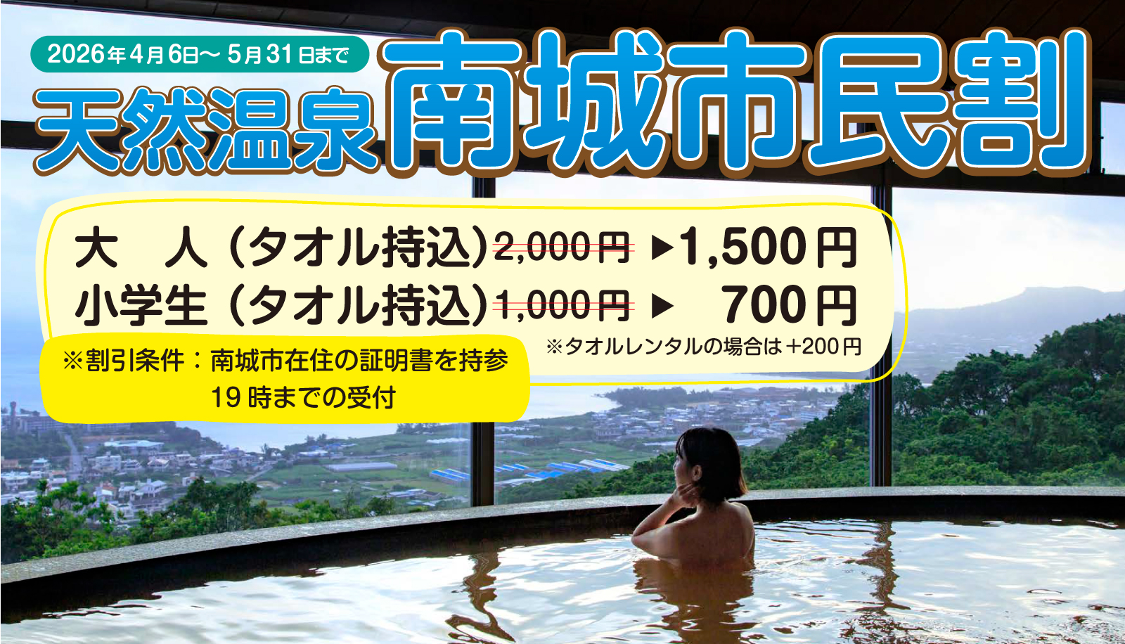 【日程】 2026年4月6日〜5月31日まで 【料金】 大人通常タオル持ち込み2,000円→1,500円 小学生通常タオル持ち込み1,000円→700円 タオルレンタルは+200円 ※割引条件:南城市在住の証明書を持参、19時までの受付