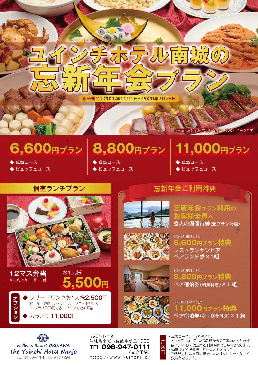 早いもので忘新年会の季節が近づいてまいりました!ご宴会のご予約はおすみですか?ユインチでは豪華特典付きで特別に3プラン6コースをご用意してお待ちしております。